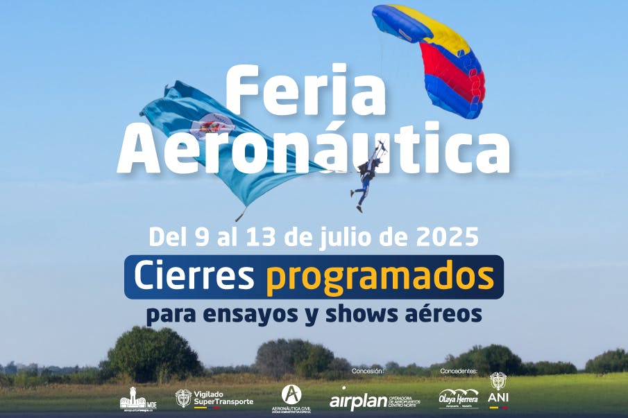 Ten presente que es la Feria Aeronáutica más importante del país, por eso, si tienes vuelos agendados en esas fechas, desde o hacia nuestro aeropuerto internacional José María Córdova, es fundamental que conozcas los cierres que tendremos para los ensayos y shows aéreos, todos ellos programados y autorizados por la Aeronáutica Civil, e igualmente concertados con las aerolíneas. Esto significa que los itinerarios que coincidan con los siguientes días y horas, ya debieron ser reprogramados.