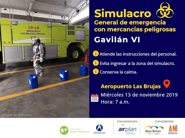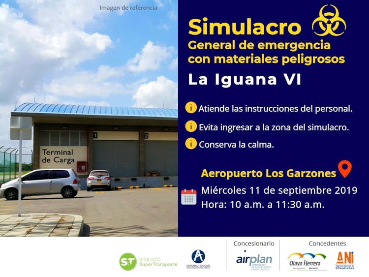 Entre las 10 y la 11:30 a.m. de este miércoles 11 de septiembre, se adelantará un simulacro general: materiales peligrosos denominado La Iguana VI, que tendrá lugar en la zona de carga del Aeropuerto Los Garzones. El ejercicio implicará la activación total o parcial de las acciones contenidas en el plan de emergencias del terminal aéreo.