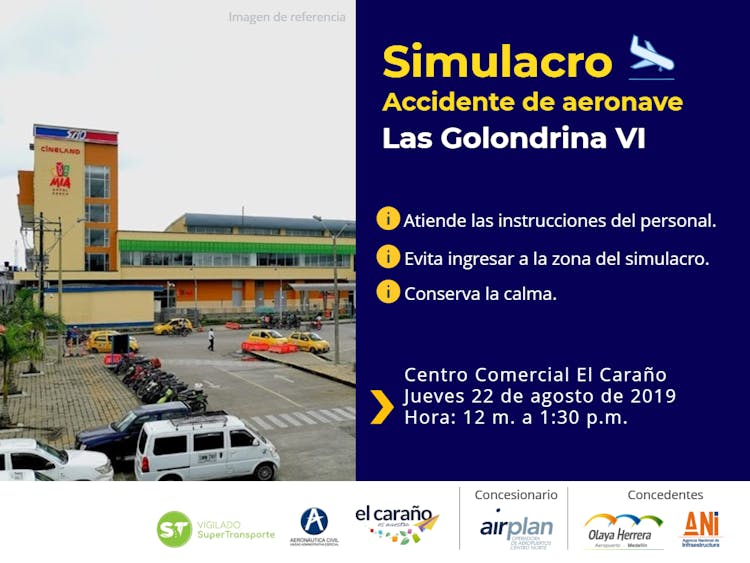 Entre las 12 m y la 1:30 p.m. de este jueves 22 de agosto, se adelantará un simulacro general: accidente de aeronave denominado Las Golondrinas VI, que tendrá lugar en el parqueadero del Centro Comercial El Caraño, costado derecho de MIA Hotel Chocó.
